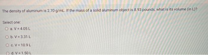 Solved The Density Of Aluminum Is 2 70 G Ml If The Mass Of Chegg Com